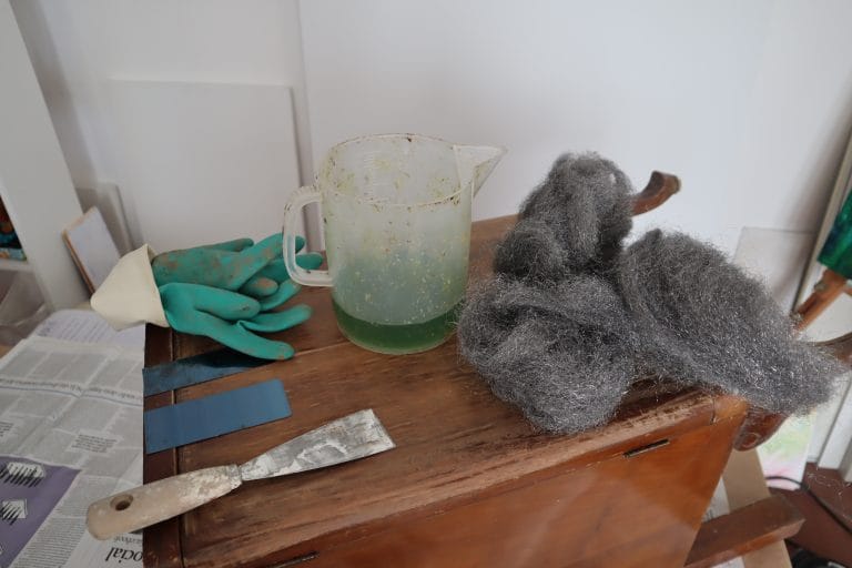 Ci servirà anche della paglietta (detta anche lana di ferro) medio-grossa, un pennello anche brutto e un paio di guanti robusti. Per robusti intendo un po’ spessi, che non si sciolgano subito a contatto con i solventi.