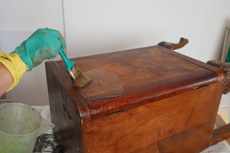 2.Usando il pennello bello carico andiamo ad applicare lo sverniciatore sul nostro mobile ( o sulla nostra parte di mobile) e lavoriamolo mentre è ancora bagnato facendo pennellate incrociate e circolini