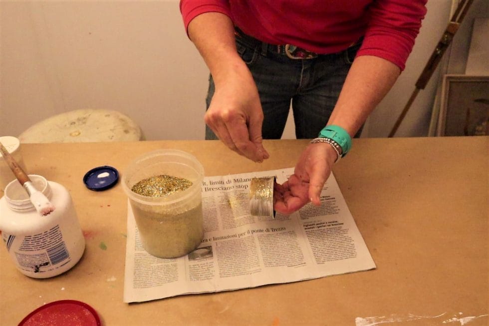 Prepariamo un foglio di giornale da tenere sotto mentre lavoriamo e, quando la colla è ancora bagnata, lasciamo cadere su tutta la nostra lattina una pioggia di glitter.
