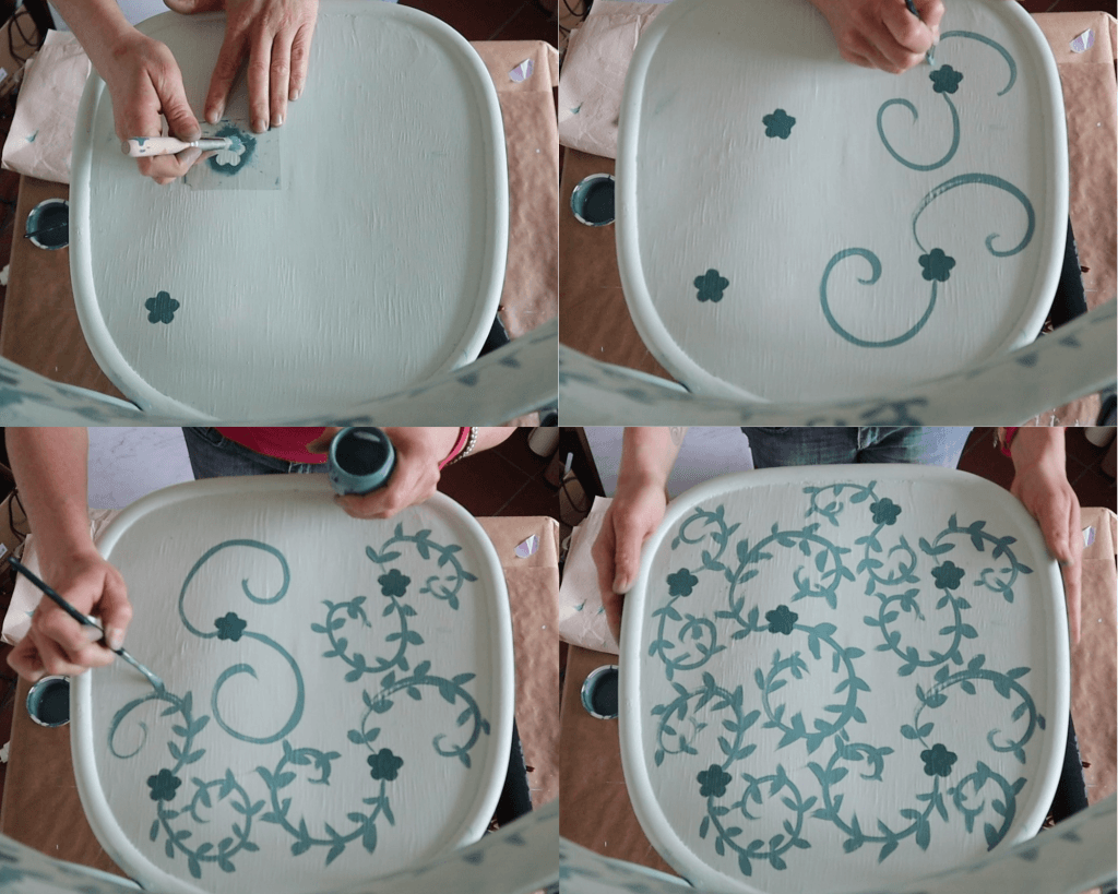 Per la parte delle foglie ho usato invece un pennello sintetico a punta tonda n. 6 disegnando direttamente a mano libera. Sembra difficile, soprattutto se non si è pratiche di disegno, ma in realtà basta seguire i passaggi e il decoro si creerà da sé. Te li descrivo bene qui sotto, vedrai quanto è semplice.