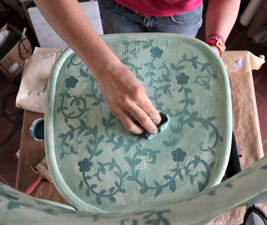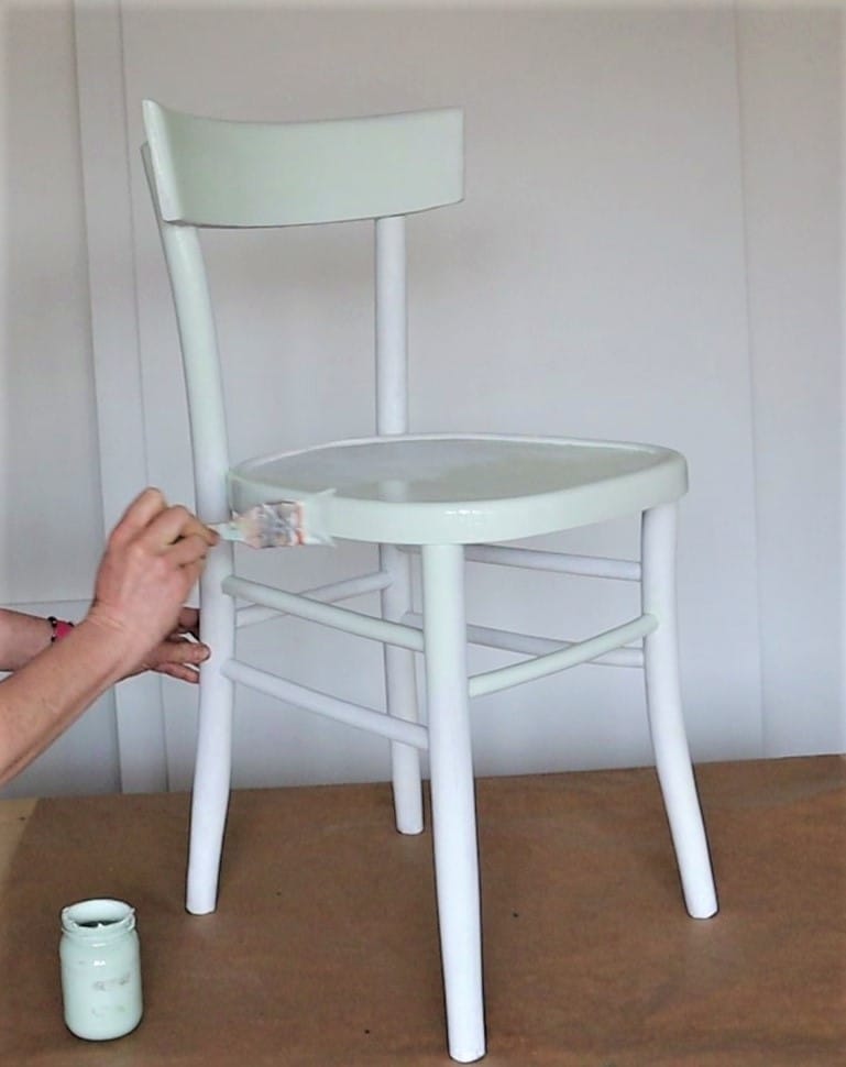 Per il restyling di questa sedia Cenerentola ho usato uno smalto all’acqua che ho tinto di un color verde chiaro. L’ho steso a pennello in due mani, sempre lasciando asciugare tra una e l’altra.