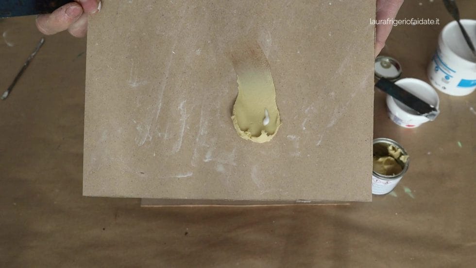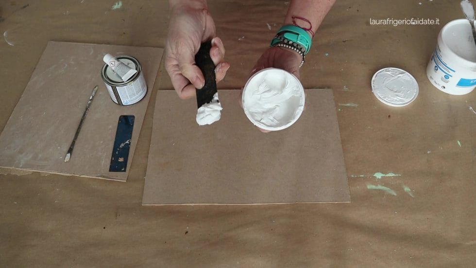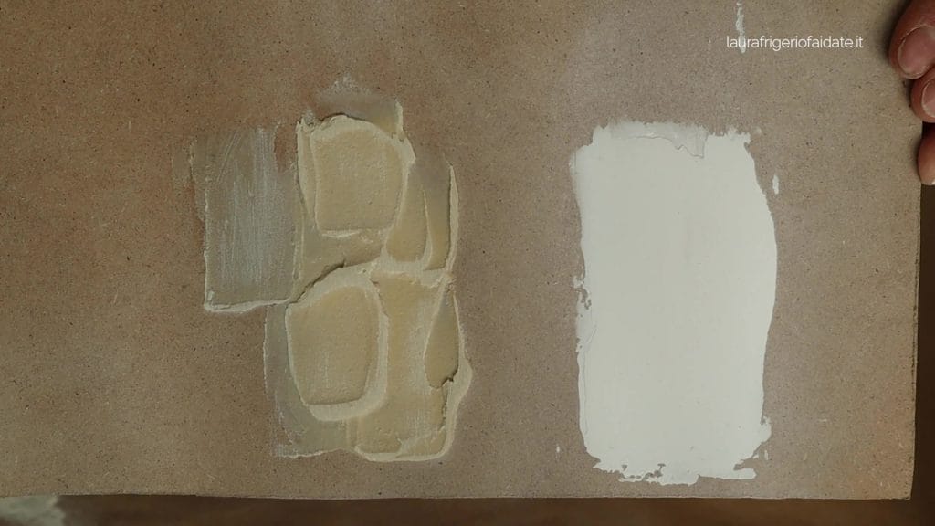 - dopo l’asciugatura si può lavorare con la carta vetro e, volendo, anche con uno scalpello per definire cornici o dettagli